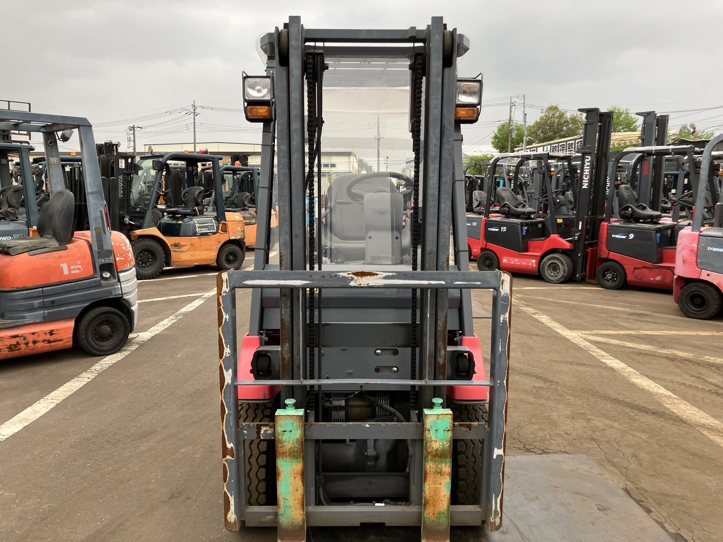 Xe sở hữu thiết kế ngồi lái với bán kính quay nhỏ, giúp di chuyển linh hoạt trong các lối đi hẹp của kho hàng, xưởng sản xuất. Khung xe chắc chắn, sơn zin còn tốt, phù hợp làm việc cường độ cao nhưng vẫn đảm bảo độ ổn định và an toàn cho người vận hành.